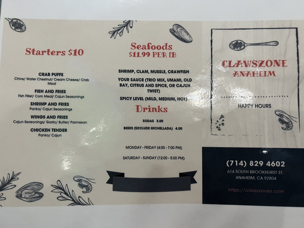 “ After a day at the beach we worked up an appetite for some sea food. I couldn't have picked a better place than Claws Zone! We were greeted right away by the server and sat immediately. The service was wonderful because they were very attentive. The food oh my gosh the food was delicious! I went with a group of 4 and we all shared the Clawzone deal which was $109. We devoured it because it was too good! We also had some garlic Cajun fries which we threw on top of it. Honestly I thoroughly enjoyed my time here. It is a great place for groups. Parking was easy as it is in this big lot so you won't have trouble finding parking. I did see they had soju options and other drinks as well, but we all just got water... this time around! ”